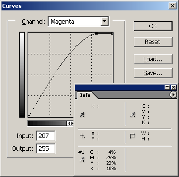 Уместно напомнить два полезных приема, существенно упрощающих работу с градационными кривыми и контрольными точками. Чтобы поместить на кривую новую точку, надо, удерживая клавишу Ctrl, щелкнуть по той области изображения, в которую требуется внести контролируемые изменения цвета. При помощи комбинации клавиш Ctrl+Tab можно перемещаться между контрольными точками градационной кривой. Помеченную контрольную точку можно перемещать при помощи стрелочных клавиш, что намного удобнее и точнее, чем перетаскивание мышкой. Понятно, что эти комбинации работают только при активном диалоговом окне Curves.