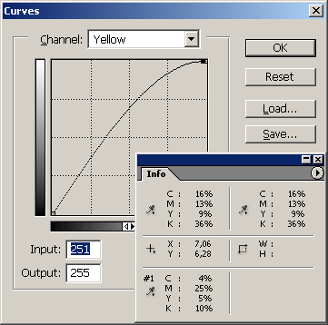 5. В списке Channel выберем канал желтой краски Yellow. Сдвинем нижнюю контрольную точку по горизонтали направо, как показано на рис. 5.22. Такое преобразование значительно увеличит вклад желтой краски в области самых темных тонов. Во всех остальных тоновых диапазонах оно повышает ее в незначительной степени. Цвет фона изображения настолько темный, что даже сильное увеличение желтой краски не повлечет за собой его видимых изменений.